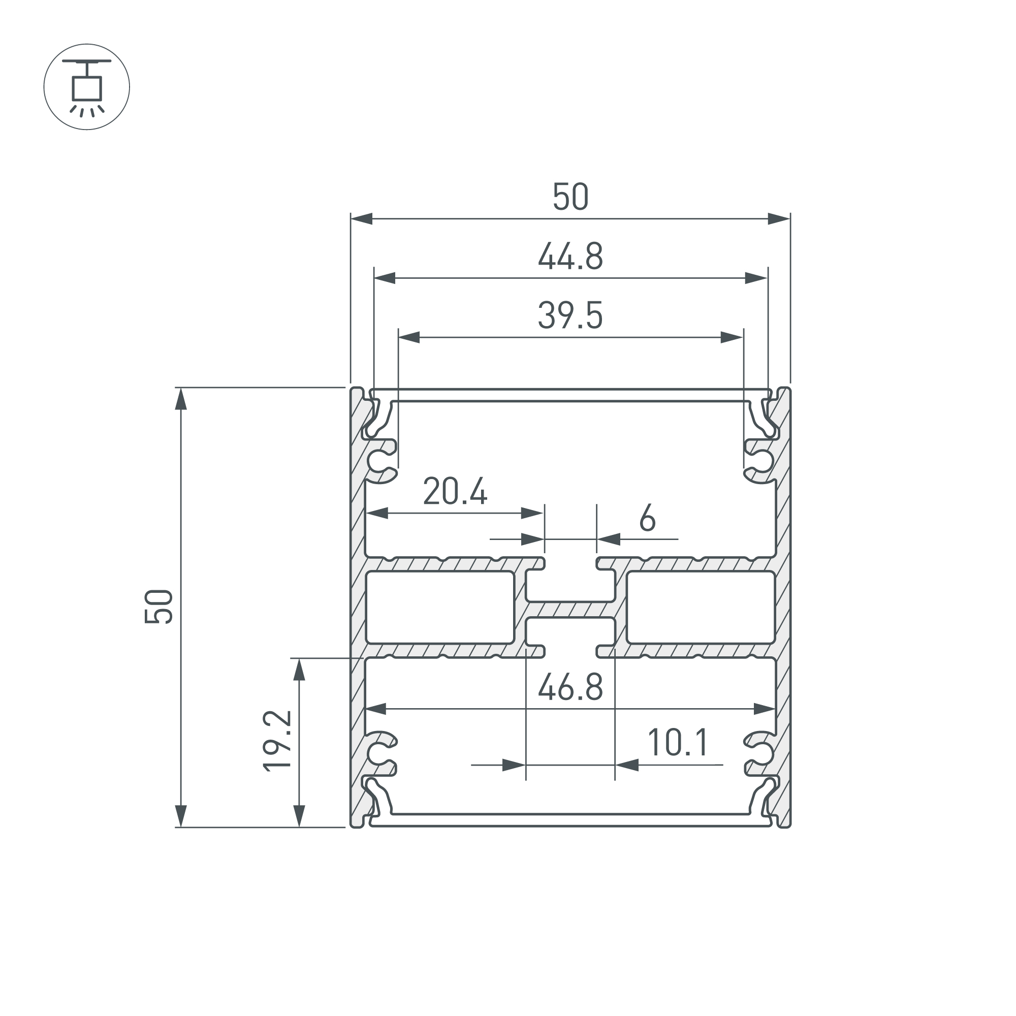Габаритные размеры профиля составляют 3000 мм в длину, 50 мм в ширину и 50 мм в высоту. Площадки для установки светодиодных лент позволяют использовать по одной ленте шириной от 19 до 46 мм и мощностью до 26 Вт/м каждая или по две ленты шириной до 20 мм и мощностью 13 Вт/м каждая. Это обеспечивает гибкость в выборе светодиодных лент и создает потрясающие световые решения.