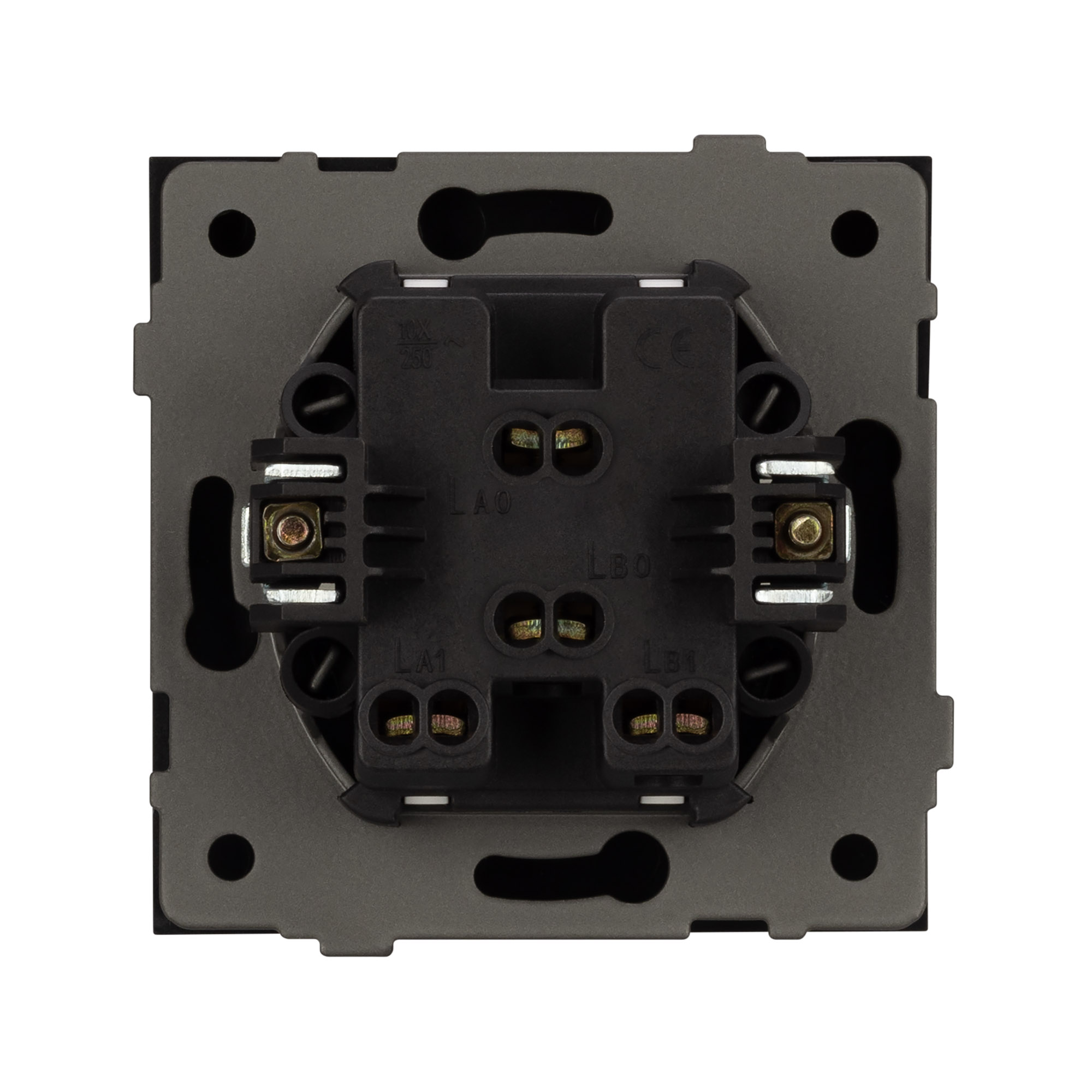Механизм выключателя управления шторами на 1 пост 2 возвратные клавиши. Цвет - черный, с Soft-Touch покрытием. Без фронтальной рамки. Уровень пылевлагозащиты IP20. Выключатель устанавливается в стандартный подрозетник круглого сечения диаметром 60мм.