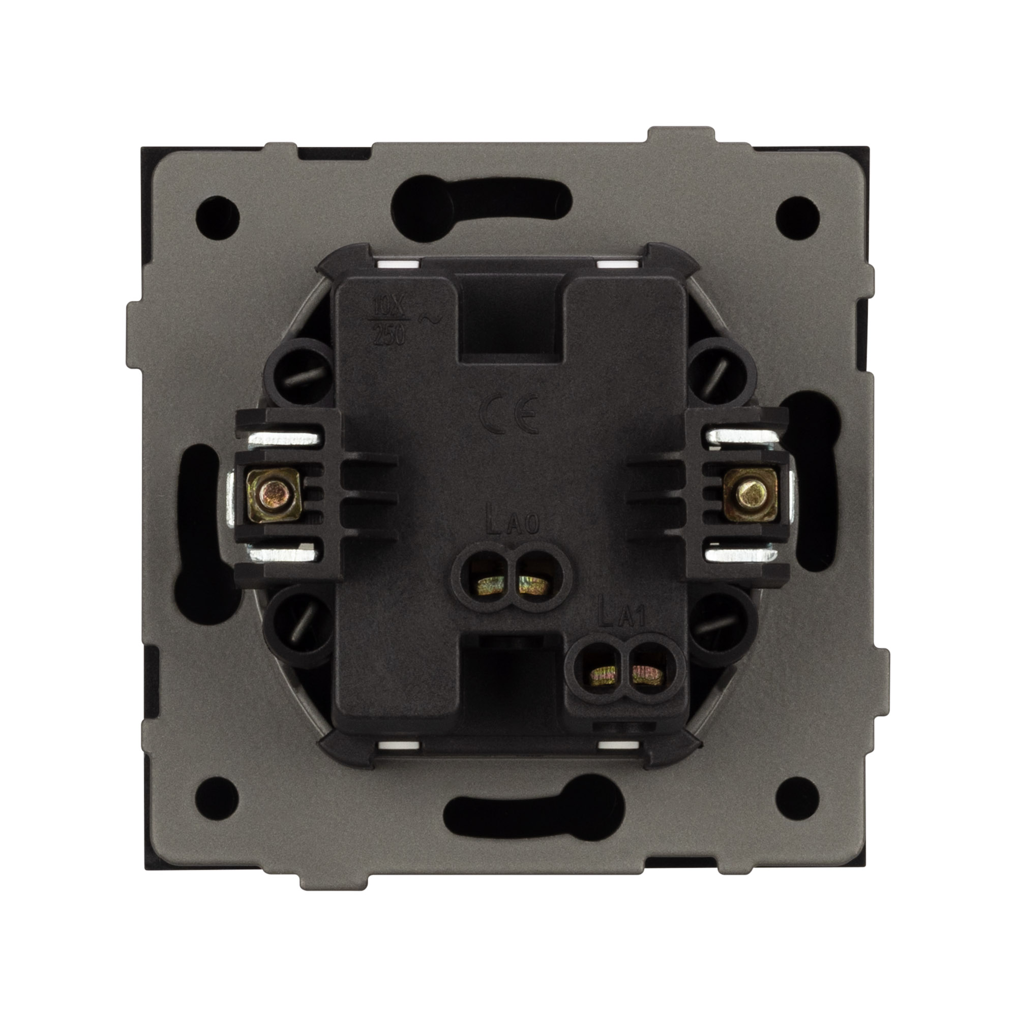 Механизм выключателя света клавишный на 1 пост 1 клавиша (перекрестный). Цвет - черный, с Soft-Touch покрытием. Без фронтальной рамки. Уровень пылевлагозащиты IP20. Выключатель устанавливается в стандартный подрозетник круглого сечения диаметром 60мм.