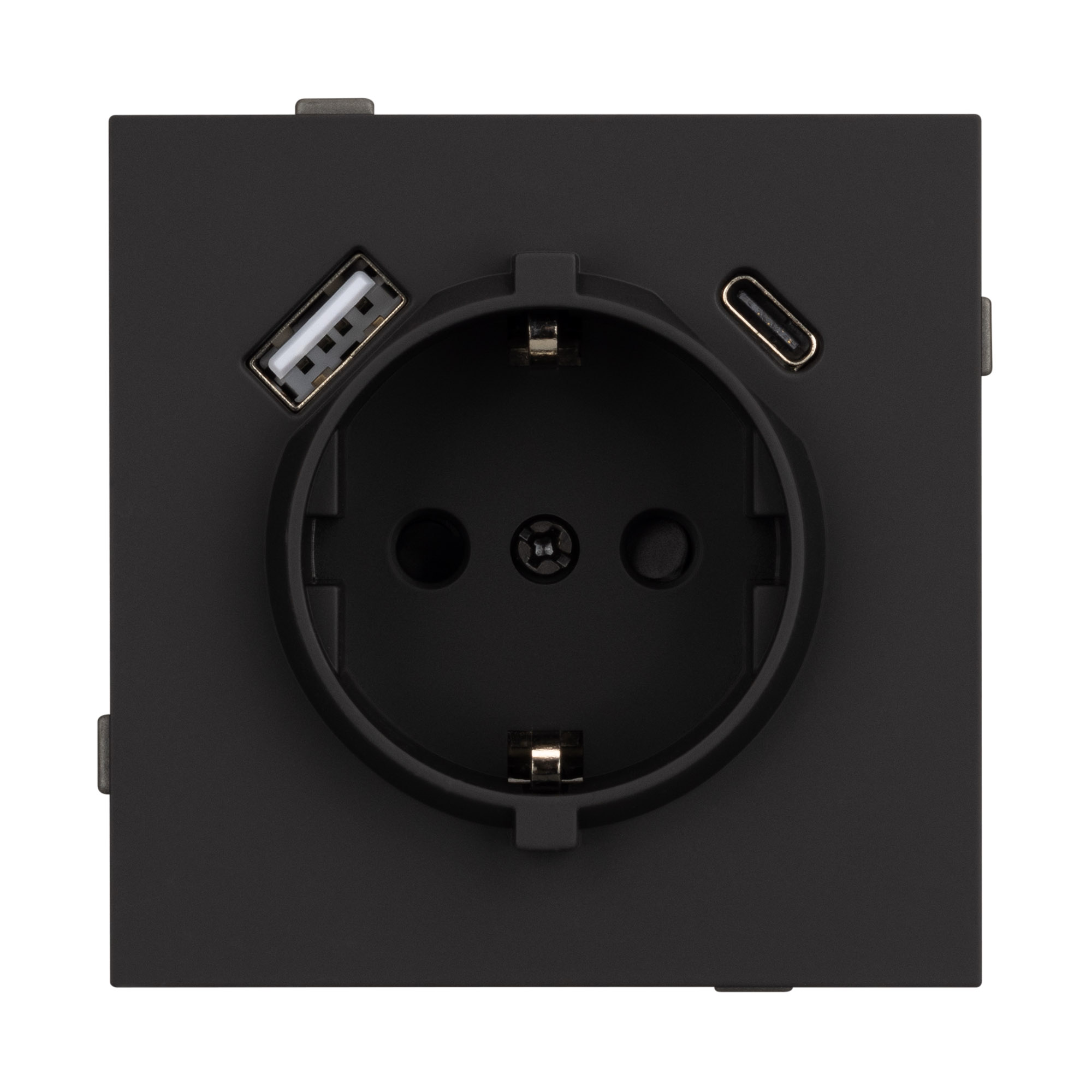 Механизм розетки с заземлением 1 пост 2 USB Type A+C порта. Цвет - черный, с Soft-Touch покрытием. Без фронтальной рамки. Уровень пылевлагозащиты IP20. Розетка устанавливается в стандартный подрозетник круглого сечения диаметром 60мм. Габаритные размеры: длина 71 мм, ширина 71 мм, высота 53 мм. Гарантийный срок 10 лет.