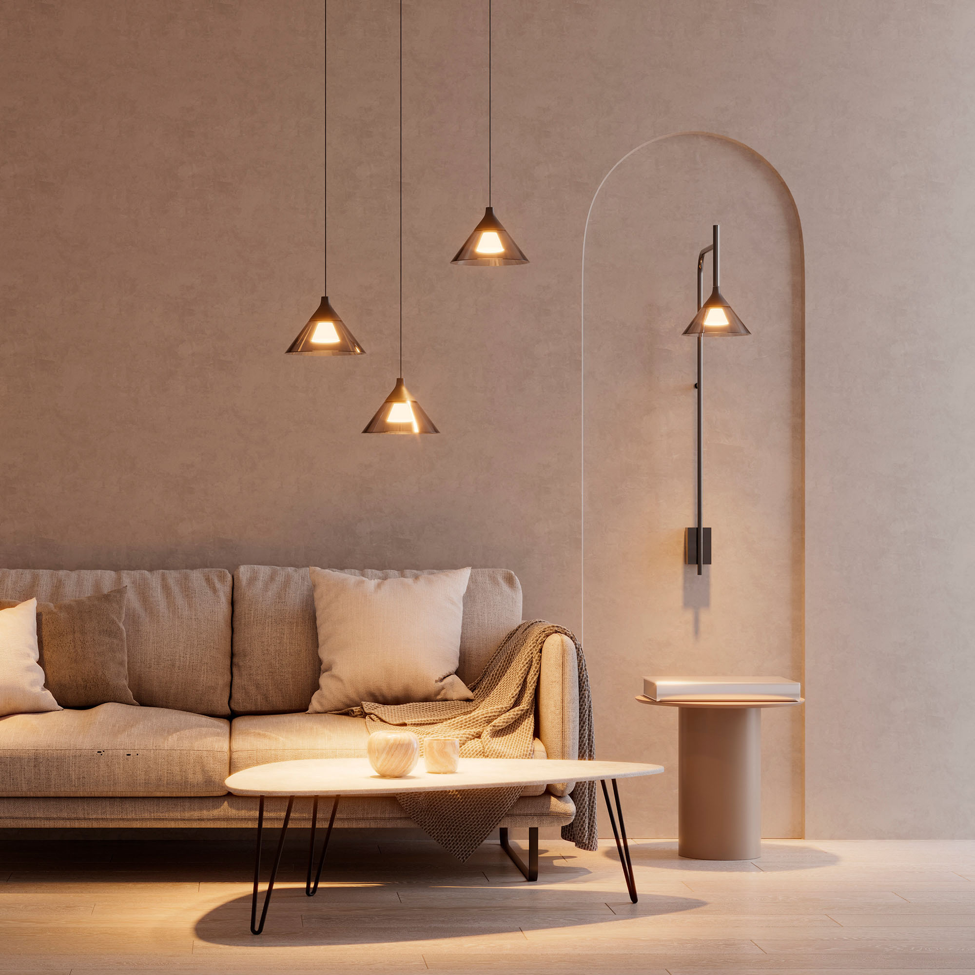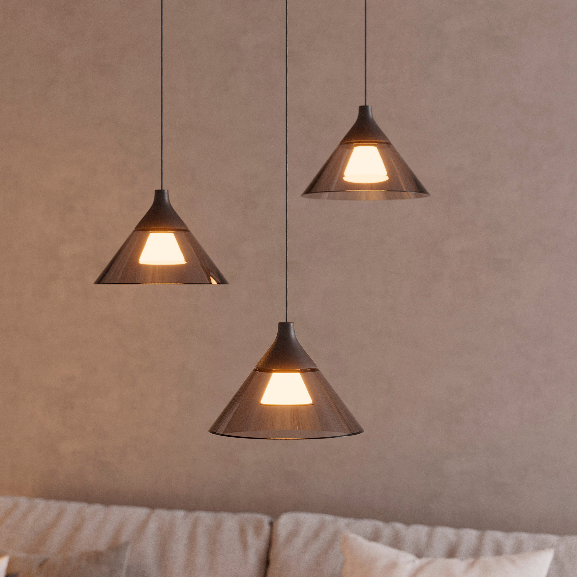 Подвесной светодиодный светильник OMBRELLO-HANG мощностью 7 Вт, теплого цвета свечения 3000 K предназначен для направленного декоративного освещения в жилых или коммерческих помещениях. Светильник с узким углом излучения 30 градусов оригинально дополнит интерьеры кухни-гостиной или зала кафе, ресторанов. Максимальная длина регулируемого подвеса 1500 мм. Подключение осуществляется с помощью входящего в комплект драйвера напрямую к сети переменного тока 230 В. Индекс CRI>94 отвечает за отличное восприятие и передачу цветовых оттенков. Низкая пульсация обеспечивает комфортное освещение без мерцания. Конусообразный плафон дымчатого цвета выполнен из стекла. Пылевлагозащита на уровне IP20 позволяет применять модель внутри помещений, где нет контакта с водой или другими жидкостями.