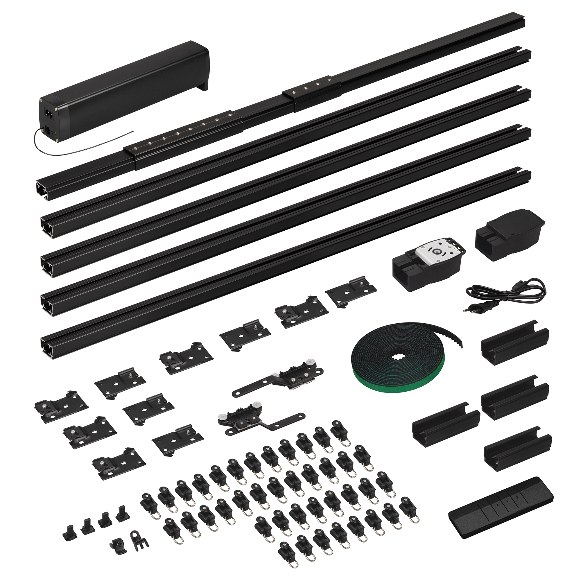 Комплект электрокарниза в черном цвете длиной до 5м (регулируется наборными частями) для раздвижных штор, состоящий из мотора, наборного алюминиевого трека, пульта и комплектующих. Электропривод с питанием 100-240В, мощность 45Вт, момент 1.2Нм, вес штор до 40кг. Управление с помощью пульта из комплекта, по WI-FI, 2.4ГГц, Bluetooth, "сухими" контактами на входе RJ45. Совместим с платформой TUYA, АЛИСА от ЯНДЕКС. Управление со смартфона через приложение SmartLife, с помощью пульта в комплекте. Ремень из комплекта находится на дне коробки. 1 мотор, 1 пульт дистанционного управления, алюминиевый профиль 1,6 мм (1м - 4шт, 0.5м - 1шт, 0.2м - 2шт., 0.1м - 1 шт.), 4 соединителя 10 см, 1 соединитель 20 см, 1 переходник 5 см, 2 шкива, 2 пряжки ремня, 2 направляющих бегунка, ремень 10,4 м, 24 бегунка, 2 фиксатора, 10 кронштейнов, 1 зажим на ремень
