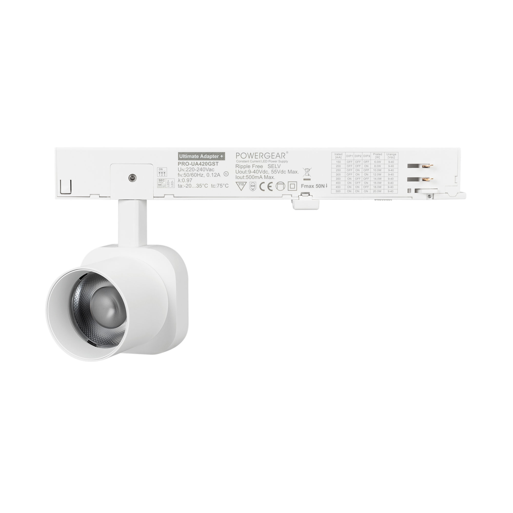Светильник для треков/шин 4 провода. Мощность 10 Вт, св. поток 740 лм, 74 лм/Вт, дневной 4000 K, CRI>95, угол 60°, напряжение питания 230 В. Решетка HONEYCOMB в комплекте. Белый квадратный корпус из алюминия, материал линзы PC поликарбонат, степень защиты IP20. Размер световой части 60х60х62 мм. Монтаж на трек 3-фазный. Драйвер встроенный 9-40 В, 250мА., пульсация <1%