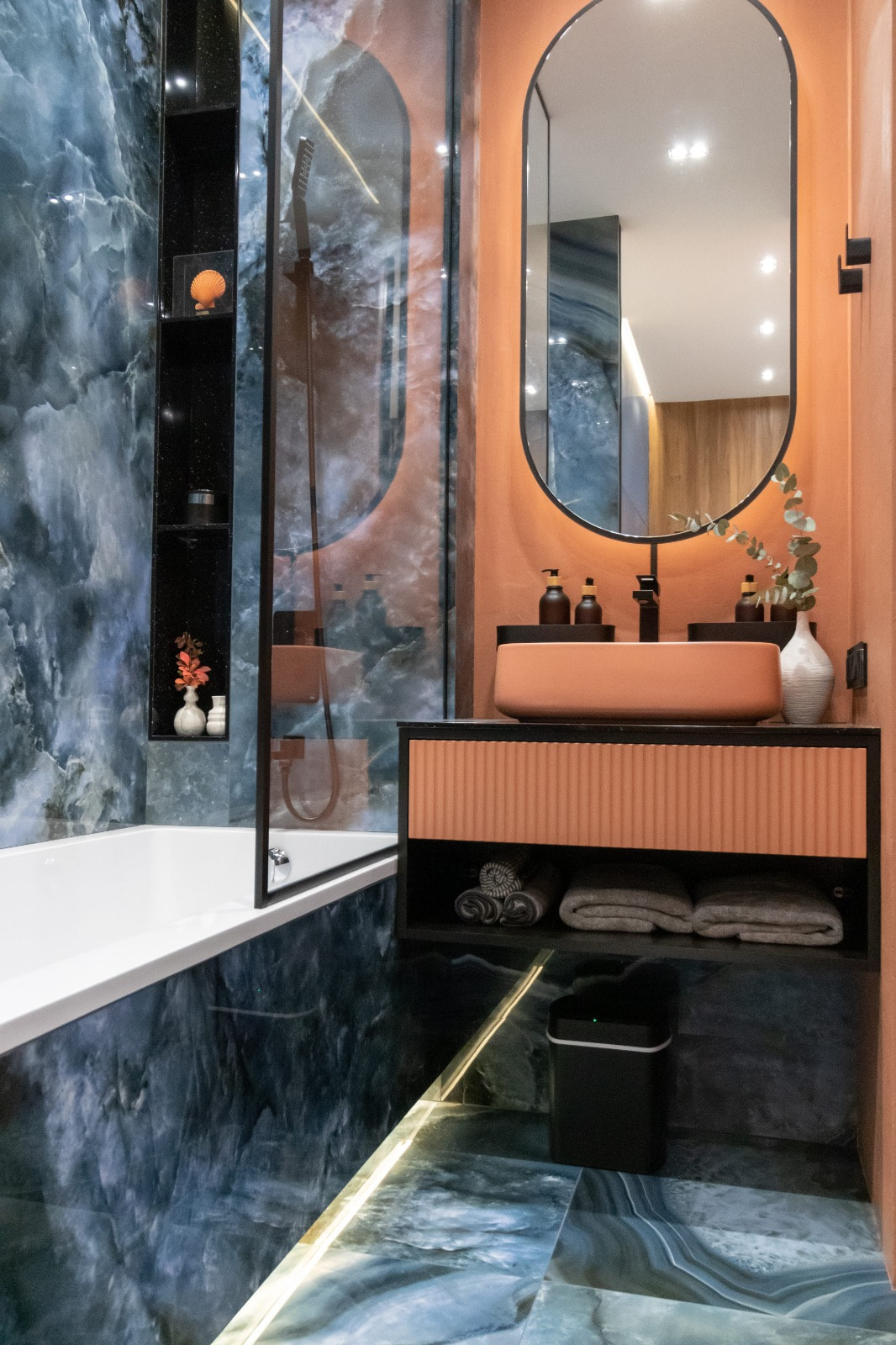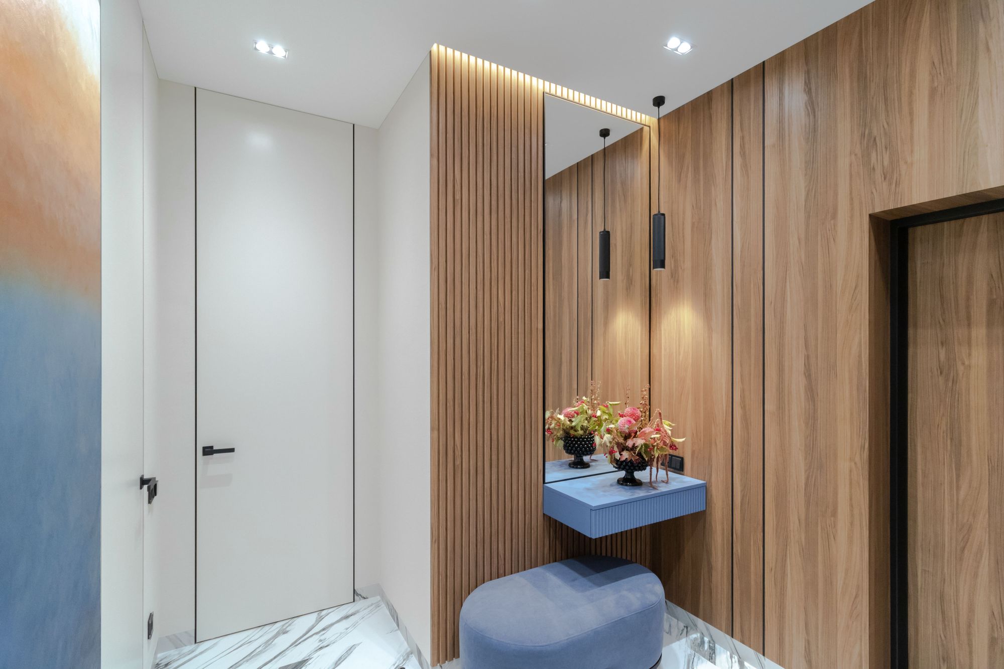 Интерьер компактной квартиры в ЖК «ЗИЛАРТ» построен на сочетании жизнерадостного персикового цвета и элегантных синих оттенков. Благодаря такой контрастной цветовой гамме пространство не перегружено и визуально выглядит шире. В свою очередь, добиться ощущения объема и воздушности помогло грамотное зонирование с помощью различных видов источников света.