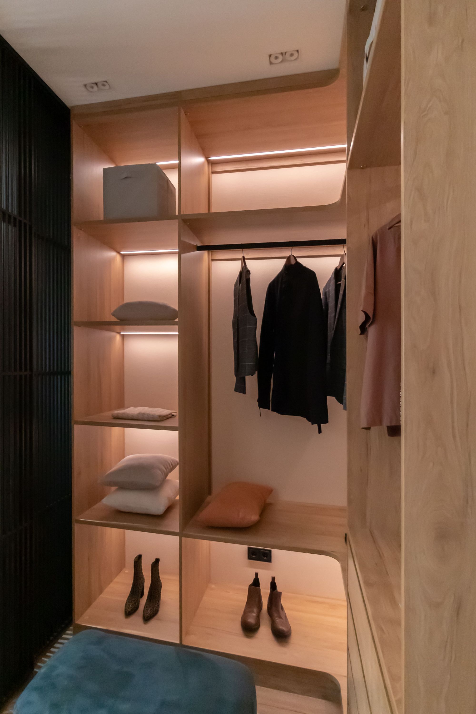 Основное освещение во всей квартире создано благодаря встроенным в потолок светильникам SIMPLE с двумя модулями. Поворотные световые модули светильников и небольшой угол излучения (45°) позволяют сделать акцент на определенной зоне комнаты и не пересветить пространство, что важно, учитывая небольшие размеры помещений. Свечение с высоким индексом цветопередачи (CRI>90) не искажает цветовую гамму интерьера.