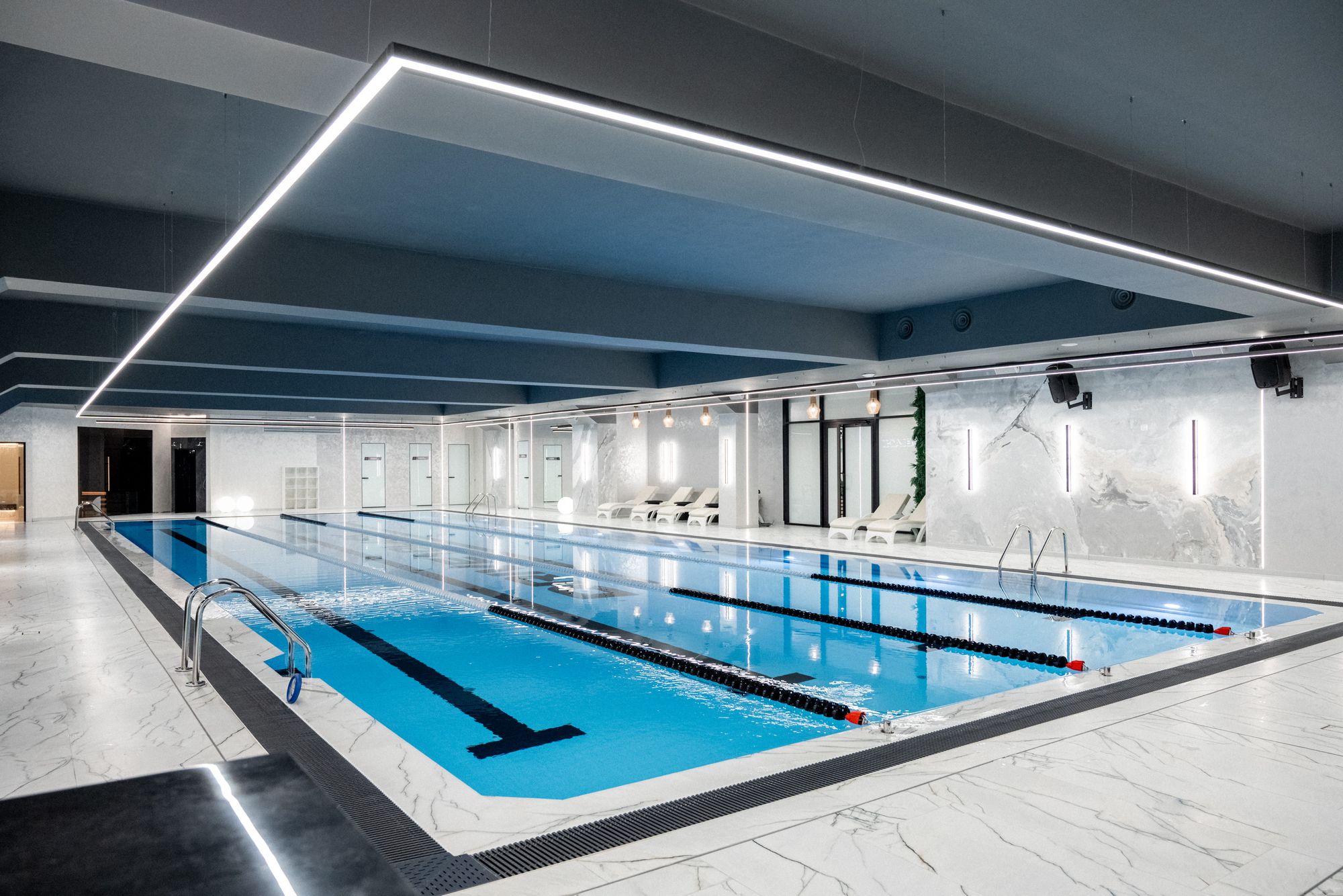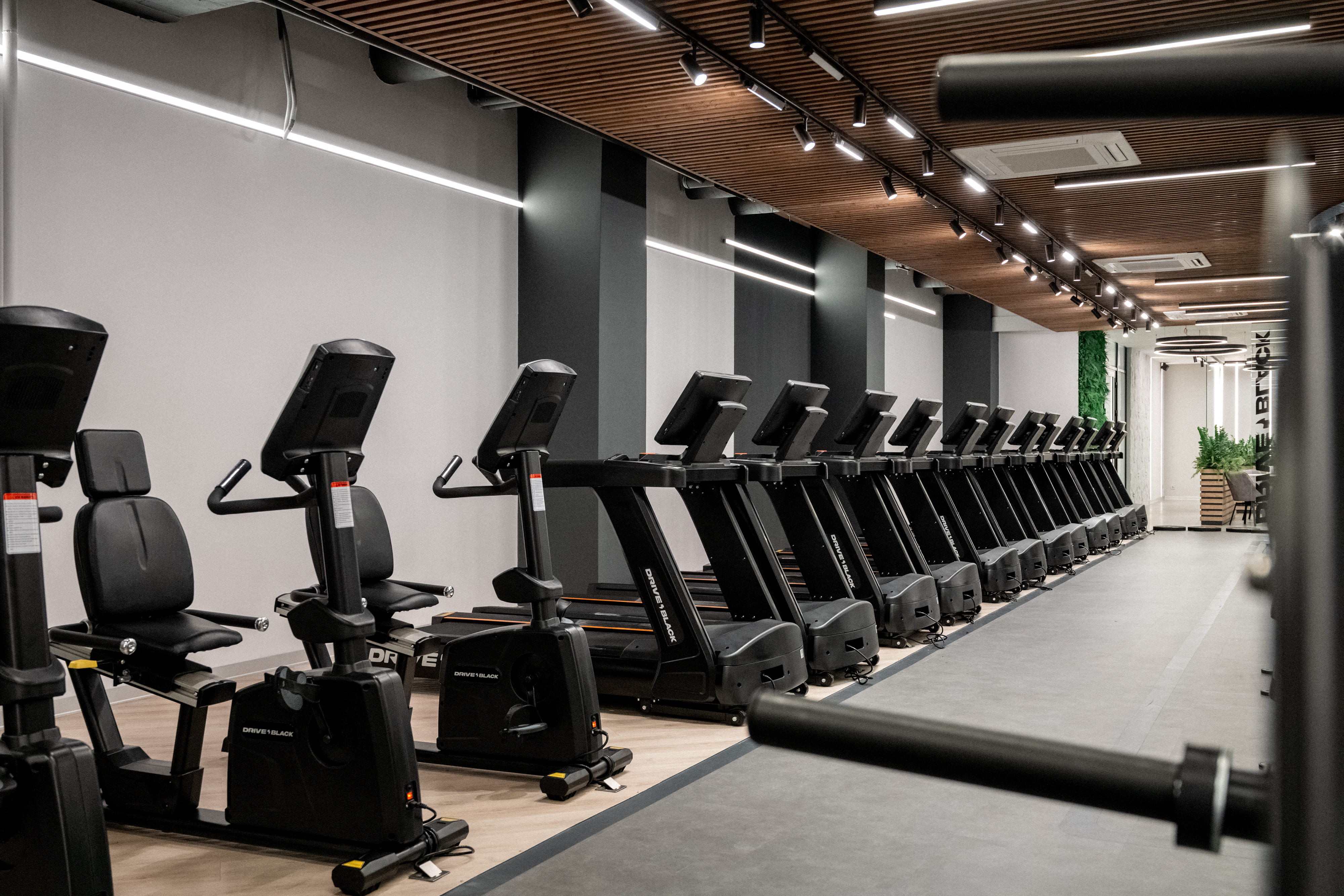 В большинстве помещений фитнес-центра на потолках можно увидеть открытые коммуникации: подвесные линии света не только легко устанавливаются в данных условиях, но и перетягивают на себя внимание от несовершенств потолков.