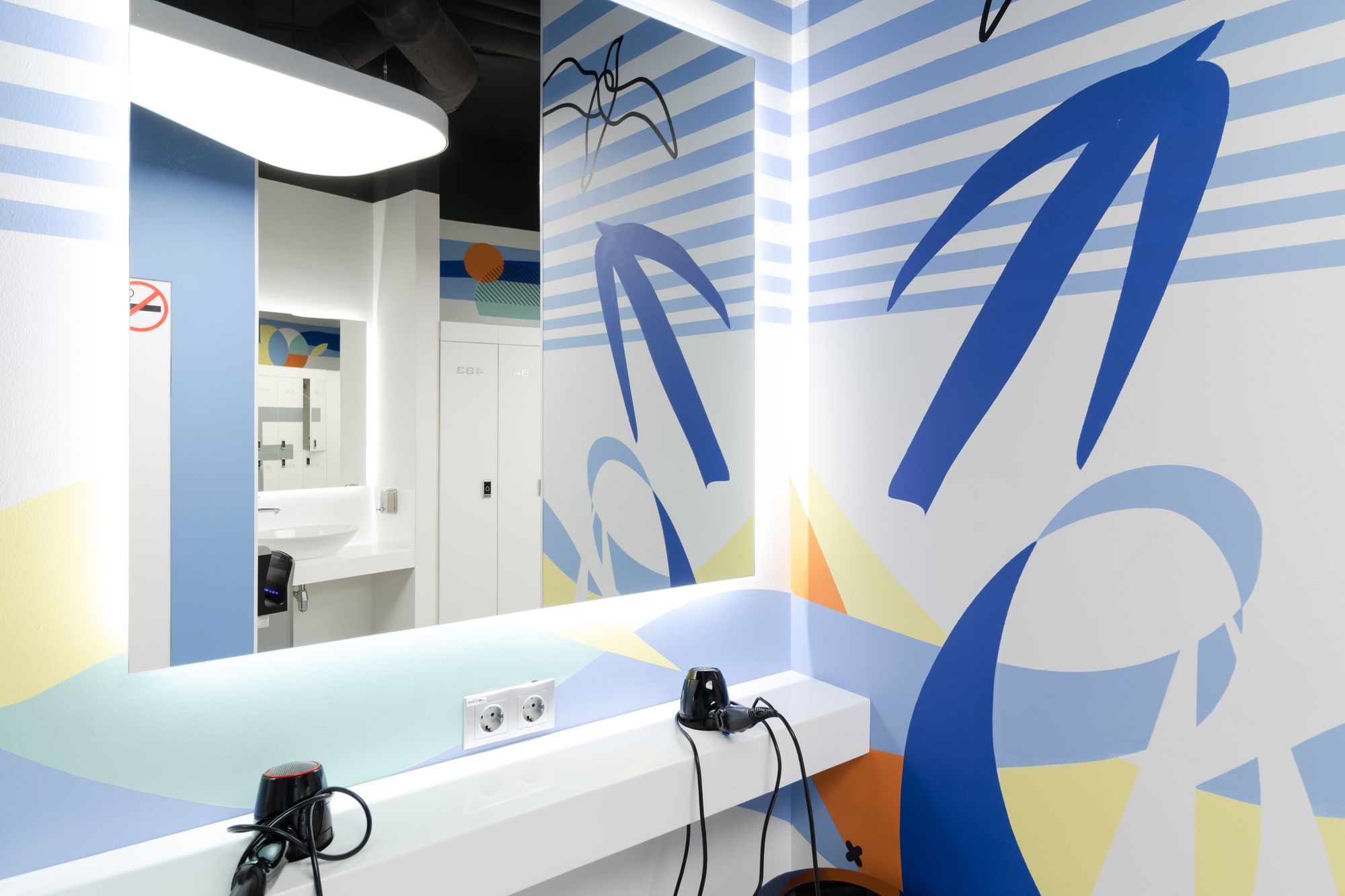 Световой дизайн построен на контрасте белого и красного, широких световых полос и тонких линий света. Линейные светильники с полупрозрачными экранами идеальны для основного освещения. Декоративная подсветка зеркал и других элементов интерьера выполнена светодиодными лентами дневного белого свечения. Границы потолка и стен в фитнес-зонах эффектно подчеркнуты линиями света.