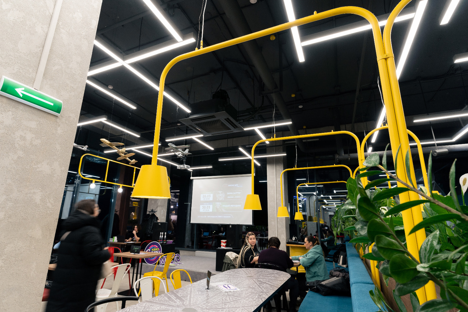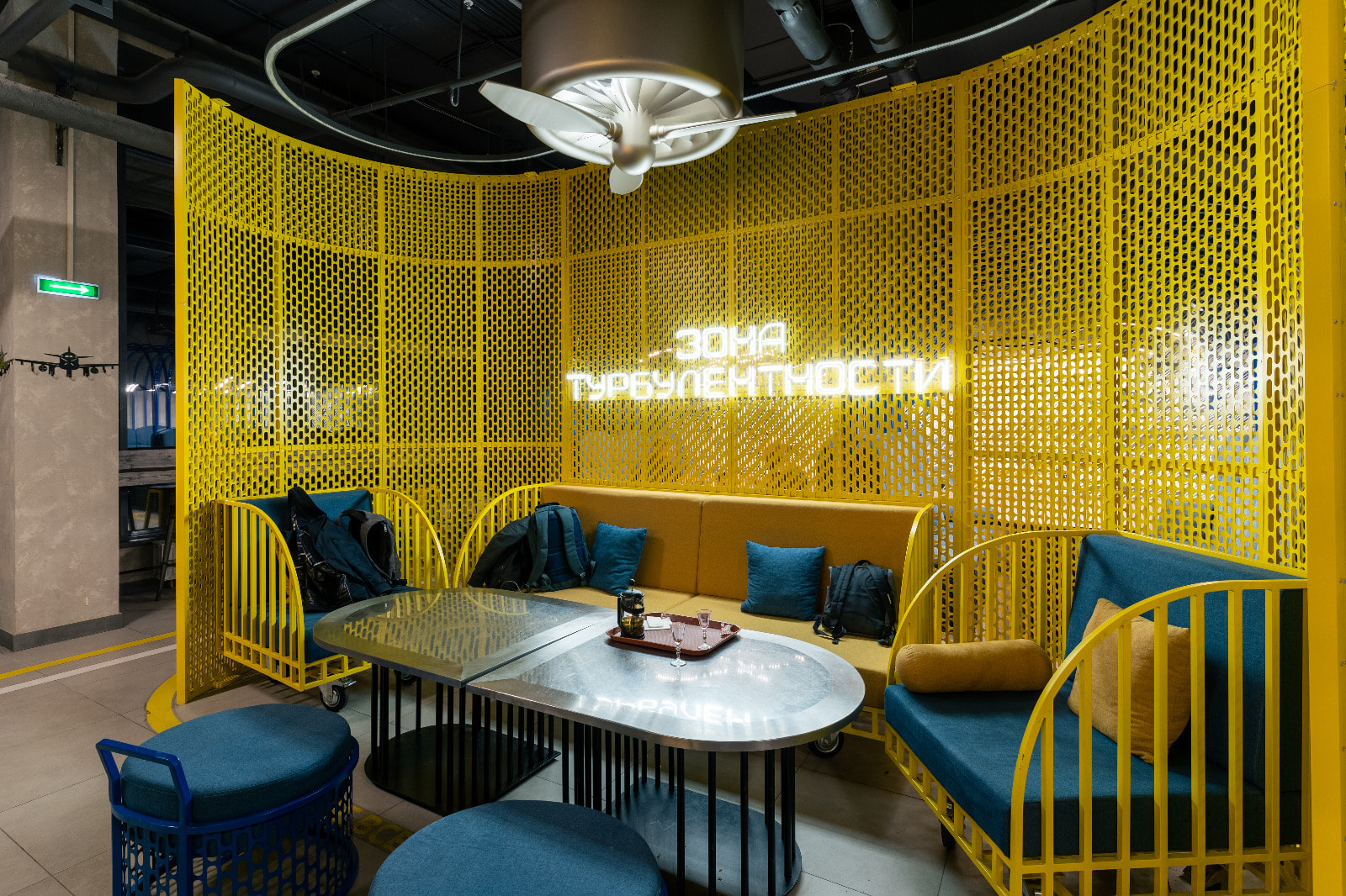 Многие пространства фудкорта идеально подходят в качестве эффектных фотозон. К примеру, зона, огороженная желтой ширмой, привлекает гостей торгового центра не только уютным расположением и креслами, стилизованными под тележки для багажа, но и стильной неоновой надписью. Еще одна оригинальная локация — двухуровневый подиум, позади которого размещено монохромное изображение самолета, подсвеченное лентой с синим свечением.