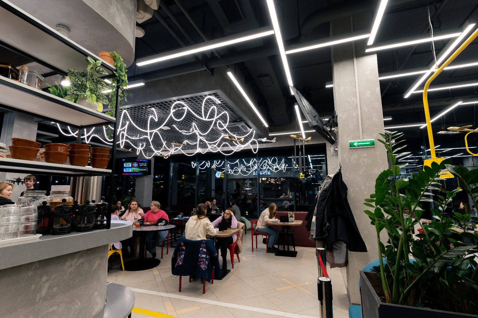Основное освещение фудкорта выполнено в дневном белом цвете (4000 К): свечение с такой цветовой температурой отличается умеренной строгостью и помогает сконцентрироваться, благодаря чему его часто используют в аэропортах. Помимо подвесных линейных светильников, для освещения зала был применен гибкий неон: волнообразные линии света, парящие в воздухе и похожие на облака, и кружащиеся среди них небольшие самолетики создают эффектную и трогательную композицию.