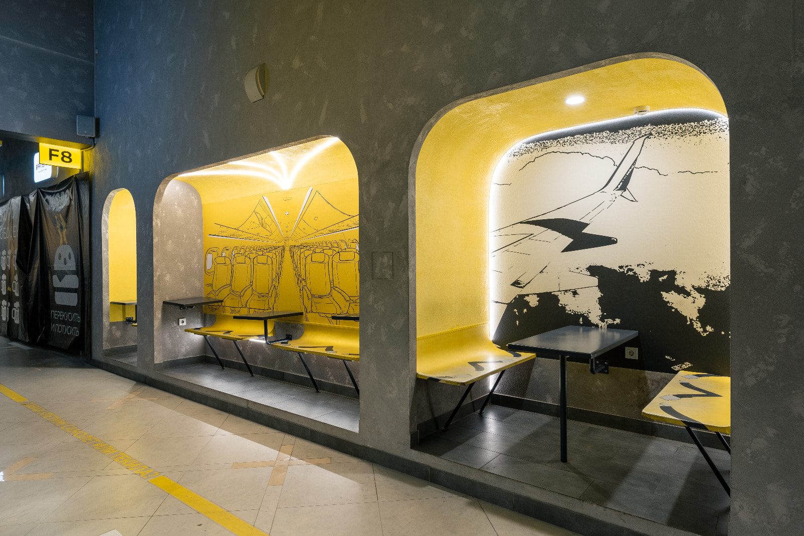 В аэропортах всегда царит особая атмосфера — время здесь замирает, несмотря на поток вечно спешащих пассажиров. Интерьер фудкорта в ТЦ «Сигма» вдохновлен романтикой воздушных портов и авиации. Каждая деталь здесь тщательно продумана: разметка на полу имитирует взлетные полосы, ресторанчики отмечены табло с номером выхода на посадку, альковы оформлены под салон самолета, а настенная графика изображает вид из иллюминатора.