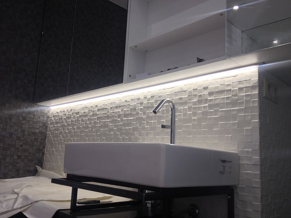 Первое - это подсветка рабочей зоны кухни - её столешницы. Для этого на нижнюю сторону навесных шкафов установили алюминиевый профиль для светодиодных лент, в нём поместили светодиодную ленту Arlight, а сверху её закрыл белый матовый экран, делающий свечение более рассеянным и мягким. Для включения и выключения подсветки был установлен выключатель с бесконтактным сенсорным датчиком. Благодаря нему включать и выключать освещение удобно даже с мокрыми или занятыми руками - достаточно просто поднести руку в область действия датчика.