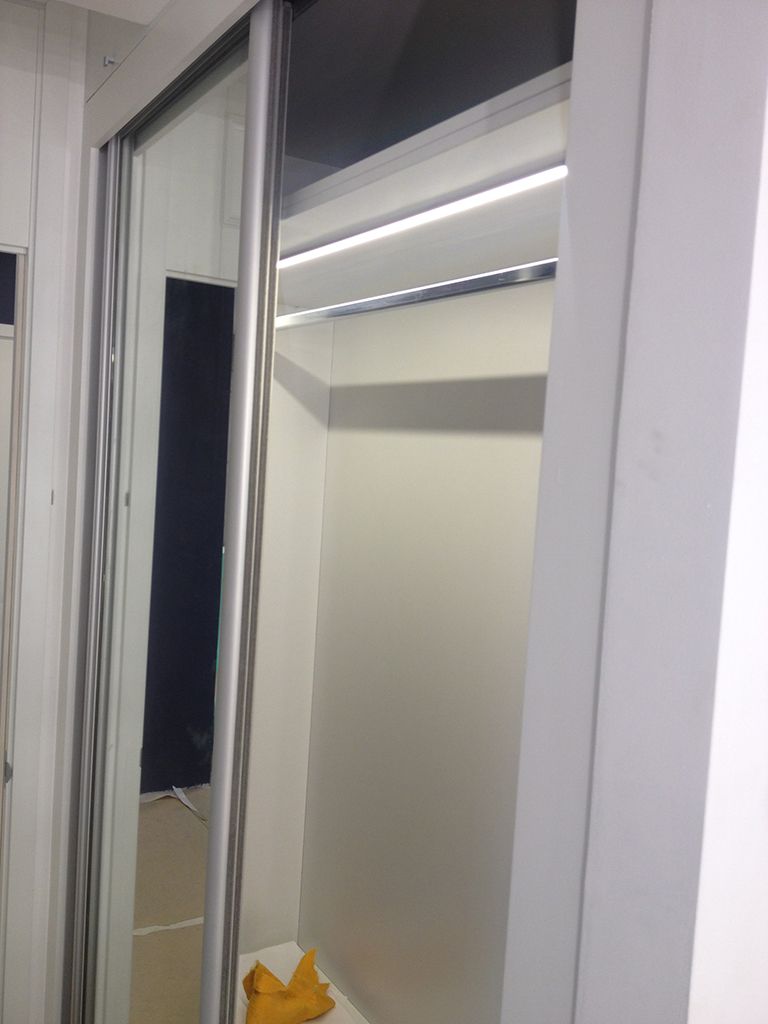 Другая часть функциональной подсветки в проекте - подсветка шкафов. Освещение гардеробов требуется не постоянно, поэтому было решено включать его только при открытии дверей. Для этого были установлены специализированные выключатели с датчиками открытия дверей, поэтому открыв двери, не требуется совершать дополнительных действий, например, нажимать на кнопку включения. Освещение шкафов включается автоматически при открытии дверей и выключается при их закрытии. Для того, чтобы датчики не бросались в глаза, и одежда не могла зацепиться за них, они были врезаны в полки шкафов. Конструкция светодиодных светильников, установленных в гардеробы, аналогична светильнику на кухне: в светодиодный профиль Arlight установлена светодиодная лента белого свечения и закрыта матовым светопропускающим экраном.