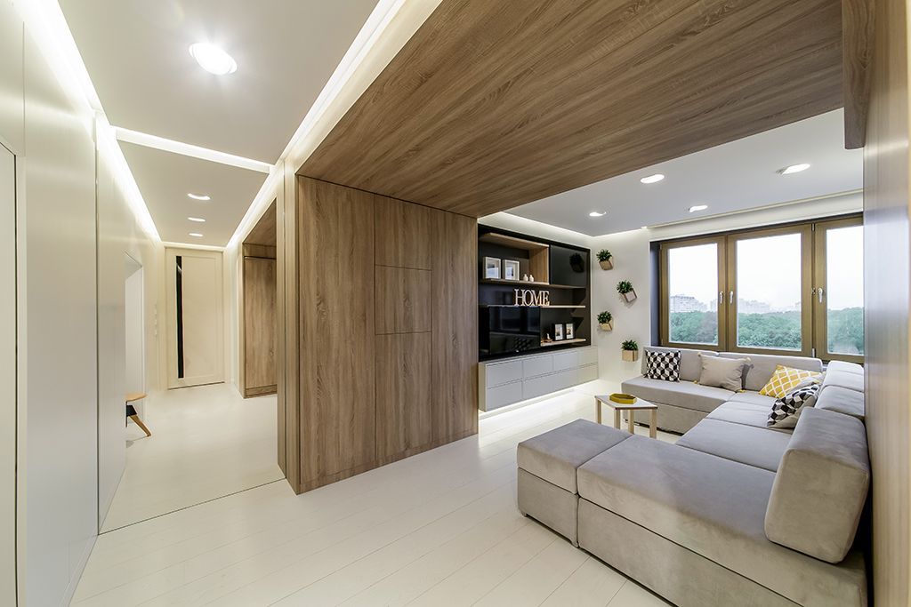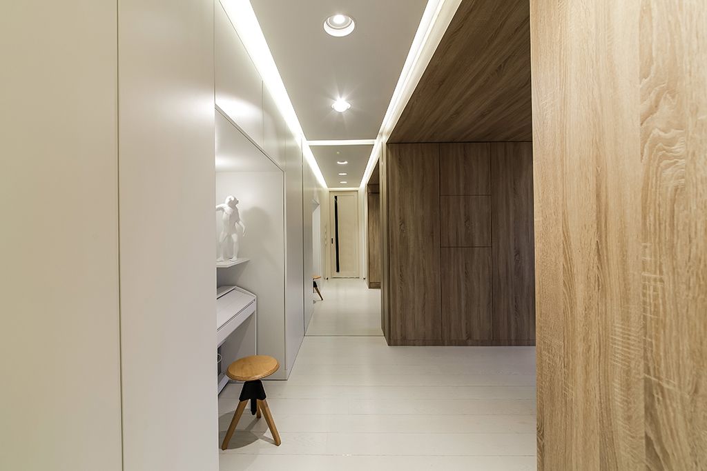 В результате комната была разделена на 3 условные зоны с помощью с помощью деревянного портала, в котором «спрятали» кровать и места хранения. Чтобы наполнить комнату светом, дизайнеры использовали белый цвет мебели, стен, пола и потолка. Особую легкость интерьеру придает светодиодная подсветка потолка и мебели.