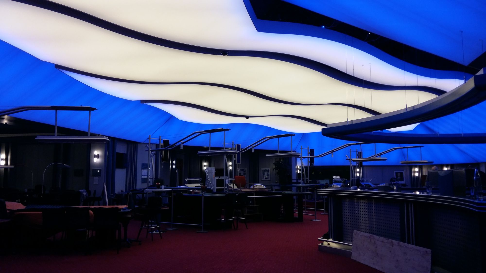 Эксклюзивный проект освещения разработан по индивидуальному проекту. В центре композиции — гигантские потолочные конструкции, представляющие собой лайтбоксы в форме волн шириной 3 м и длиной 8–15 м. Периметр игрового зала оформлен светодиодными RGB-лентами с цветодинамическими эффектами, которые можно менять с помощью сенсорной панели. Пространство казино становится удивительным местом, где свет способен играть разными оттенками, поддерживая общий игровой настрой посетителей.