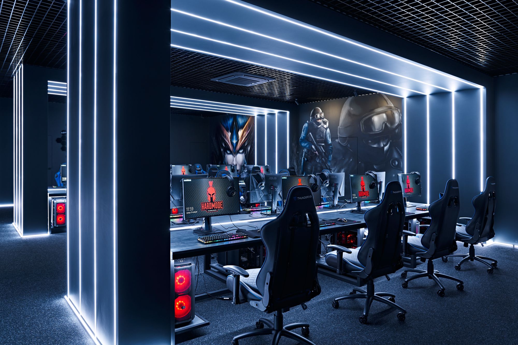 Световые линии интегрированы в стены, потолок и столы. Многоцветная RGB-лента, размещенная в компьютерных столах, управляется контроллером. Полосы света, которые плавно переходят со стен на потолок, напоминают портал, переносящий из реальности в параллельный мир. Игра контрастов впечатляет: темное помещение, яркие световые полосы и масштабные подсвеченные граффити на стенах. Персонажи игр словно находятся в движении за счет грамотно подобранных световых акцентов. Все пространство превращается в настоящую игровую арену, которая объединяет профессионалов и любителей киберспорта.