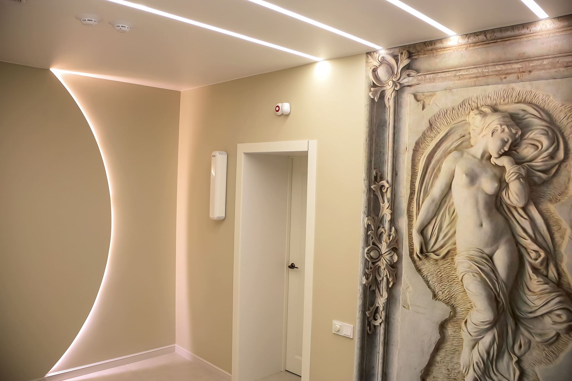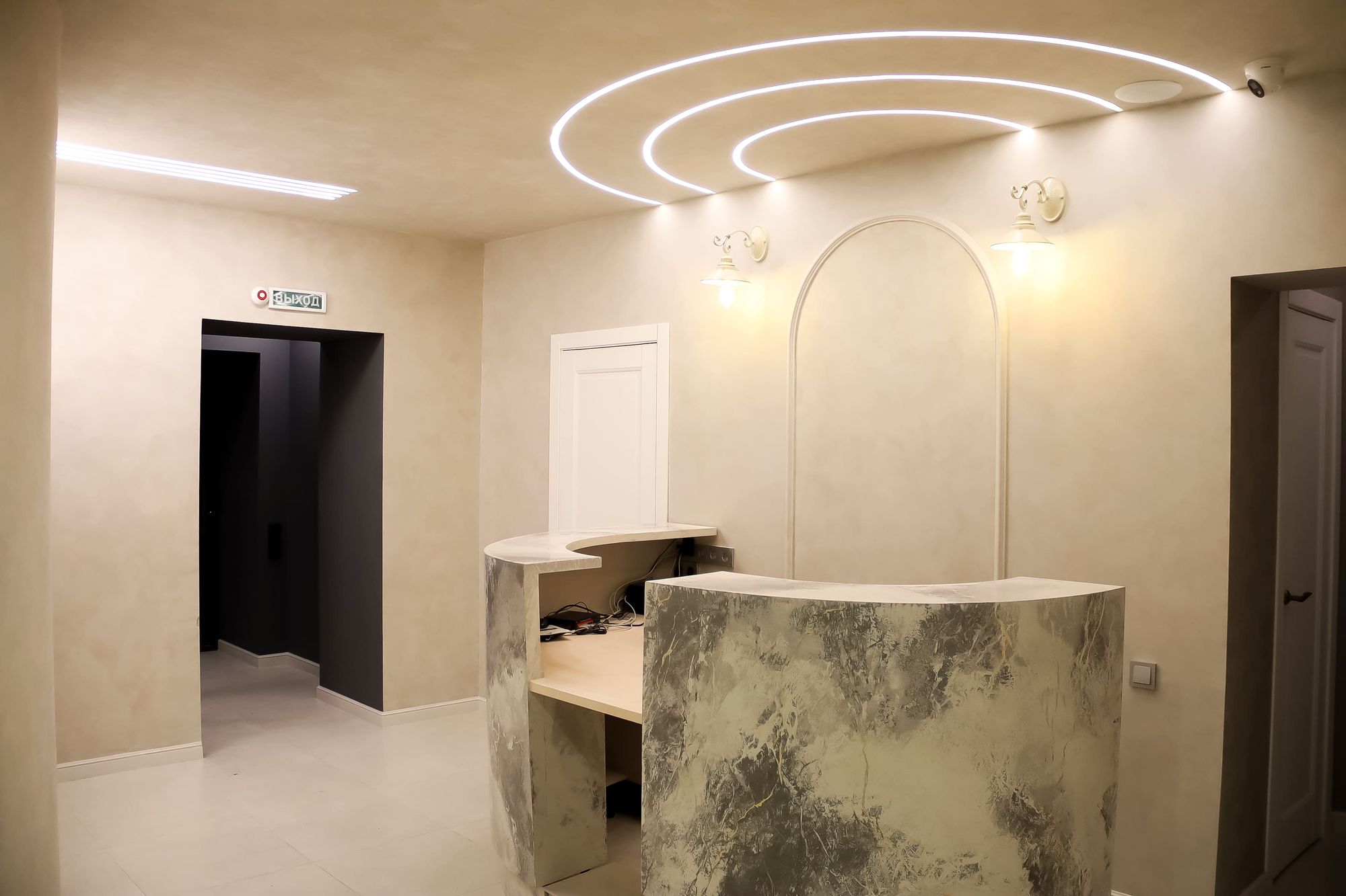 Свет в интерьере клиники соответствует общей концепции дизайна. В отделке использованы холодные оттенки белого и серого, которые подчеркиваются нейтральным дневным светом (4000 К).