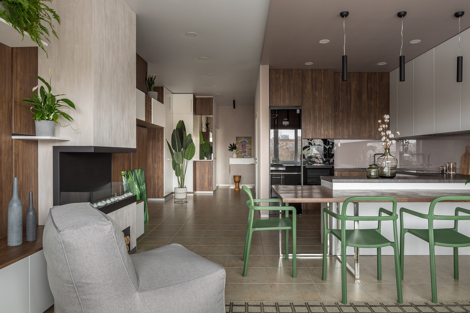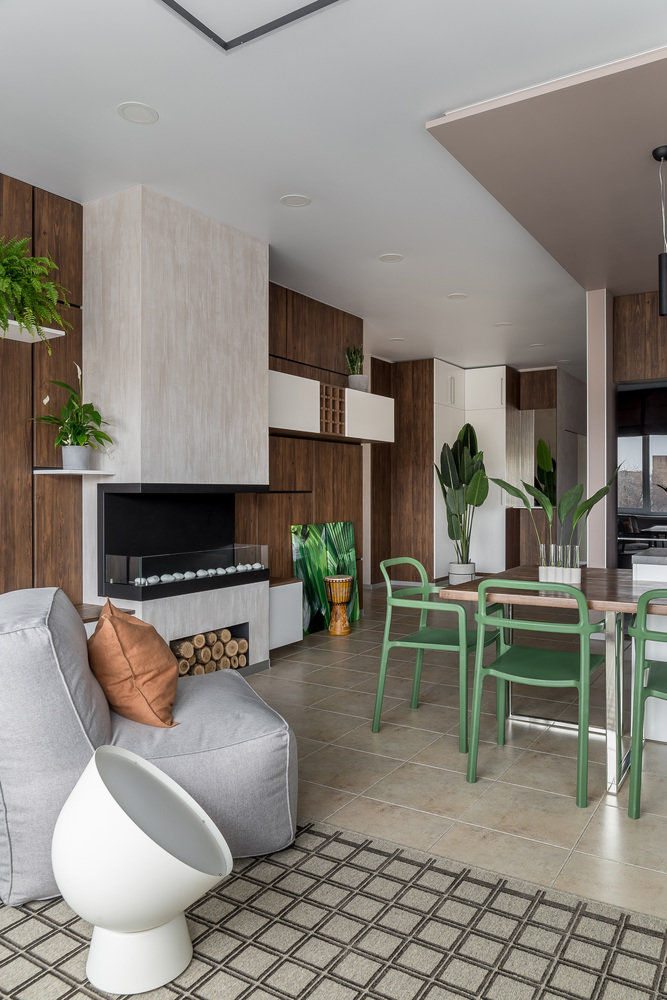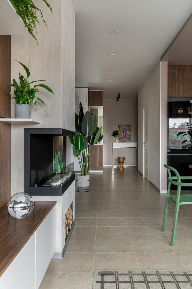 Минимум лишних деталей и стильный дизайн — такой девиз выбрали дизайнеры проекта. Освещение в коридоре и кухне-гостиной реализовано с помощью встраиваемых светодиодных панелей, которые обеспечивают хороший основной свет. Чтобы организовать локальную подсветку рабочей зоны кухни, использовали анодированный профиль со светодиодной лентой.