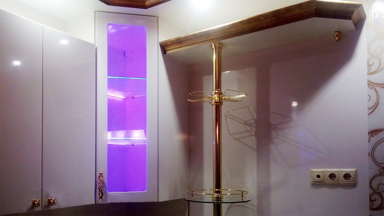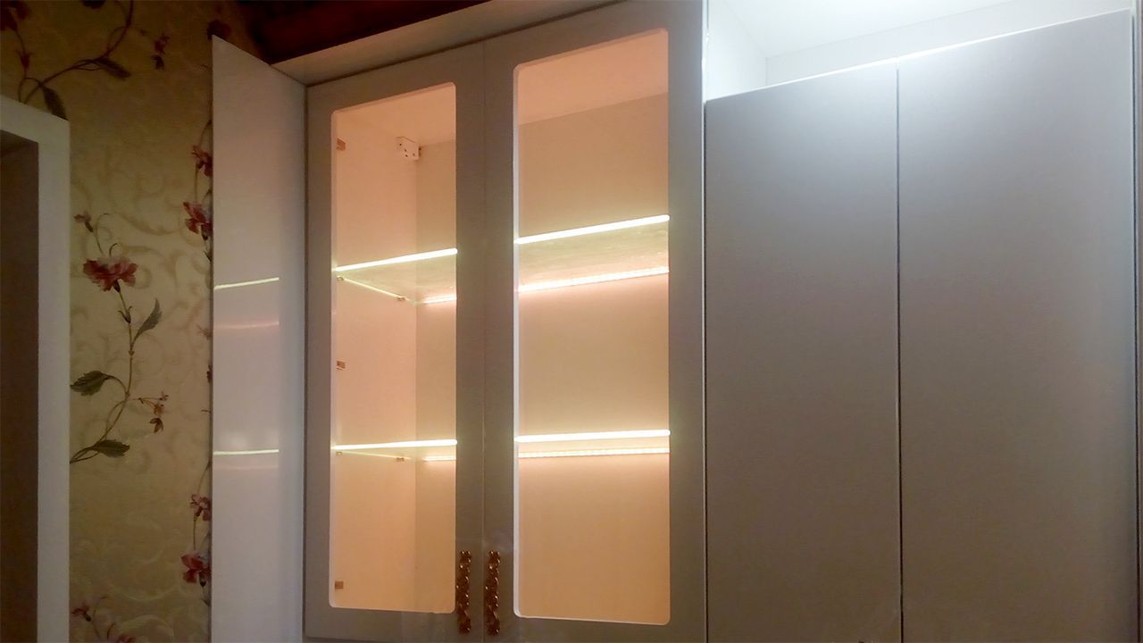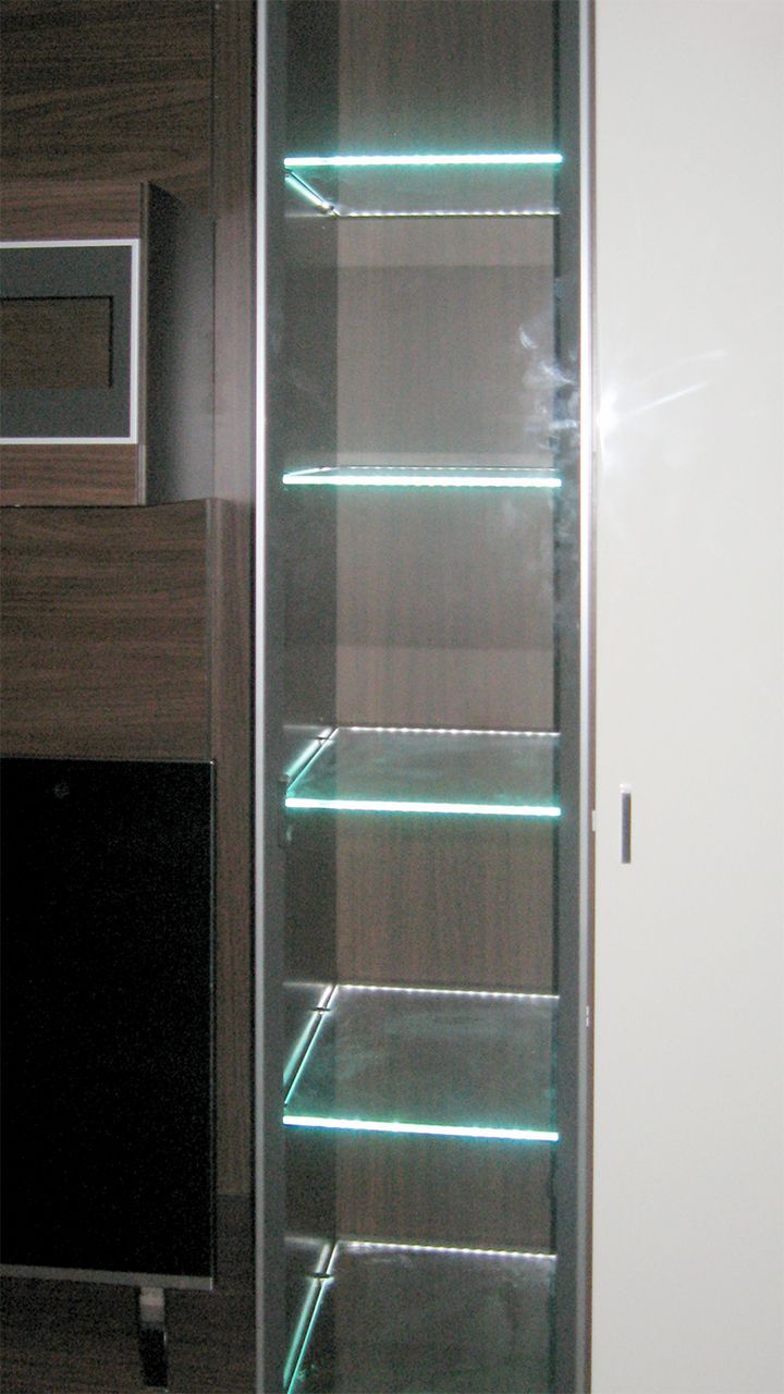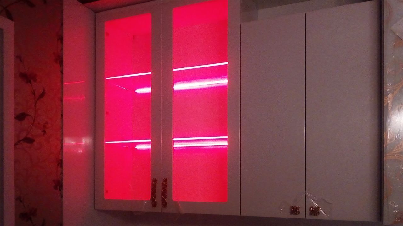 В данном проекте применена многоцветная RGB светодиодная лента, управление которой осуществляется дистанционно, при помощи небольшого сенсорного пульта. Яркость ленты позволила подсветить не только само стекло, но и пространство внутри шкафов. Такая подсветка смотрится весьма эффектно и способна подчеркнуть красоту предметов, размещённых на стеклянных полках.