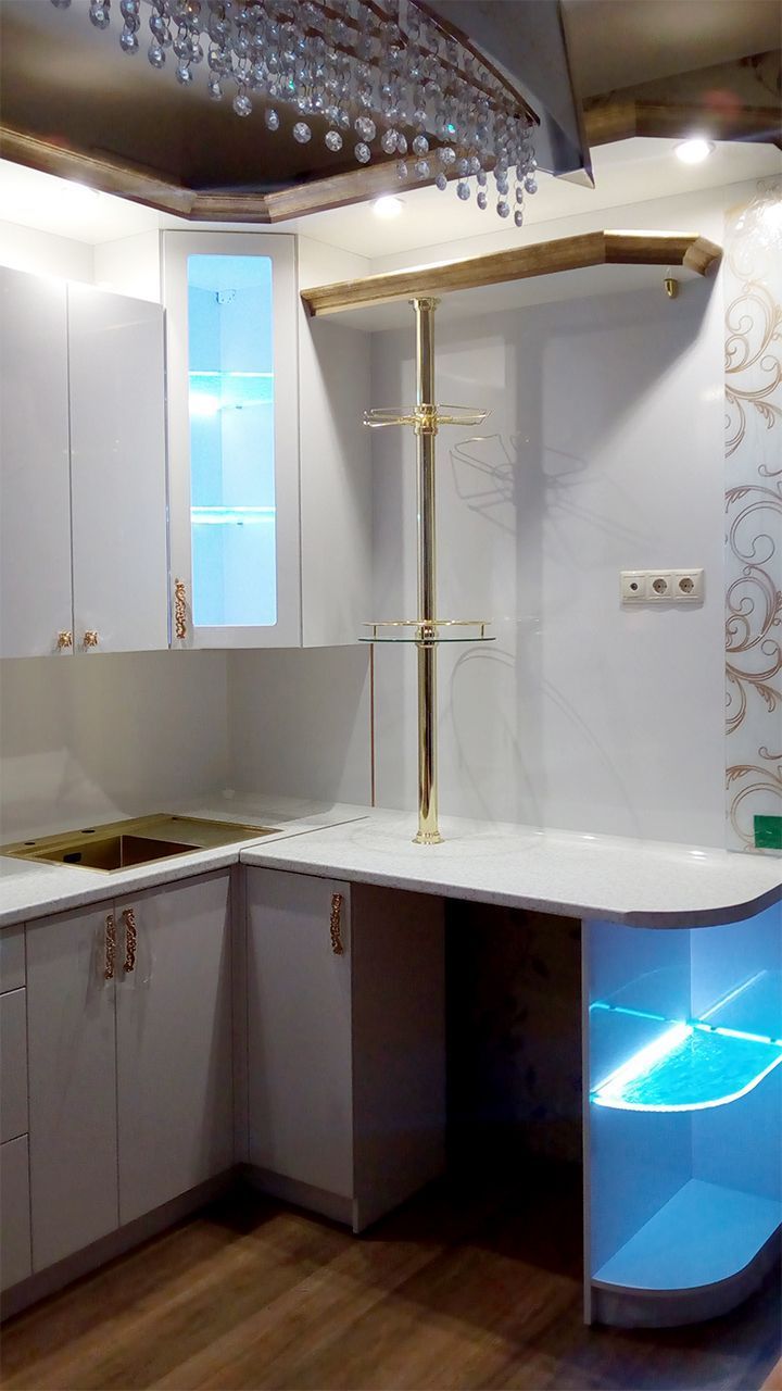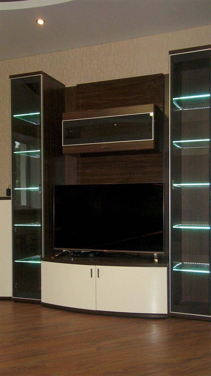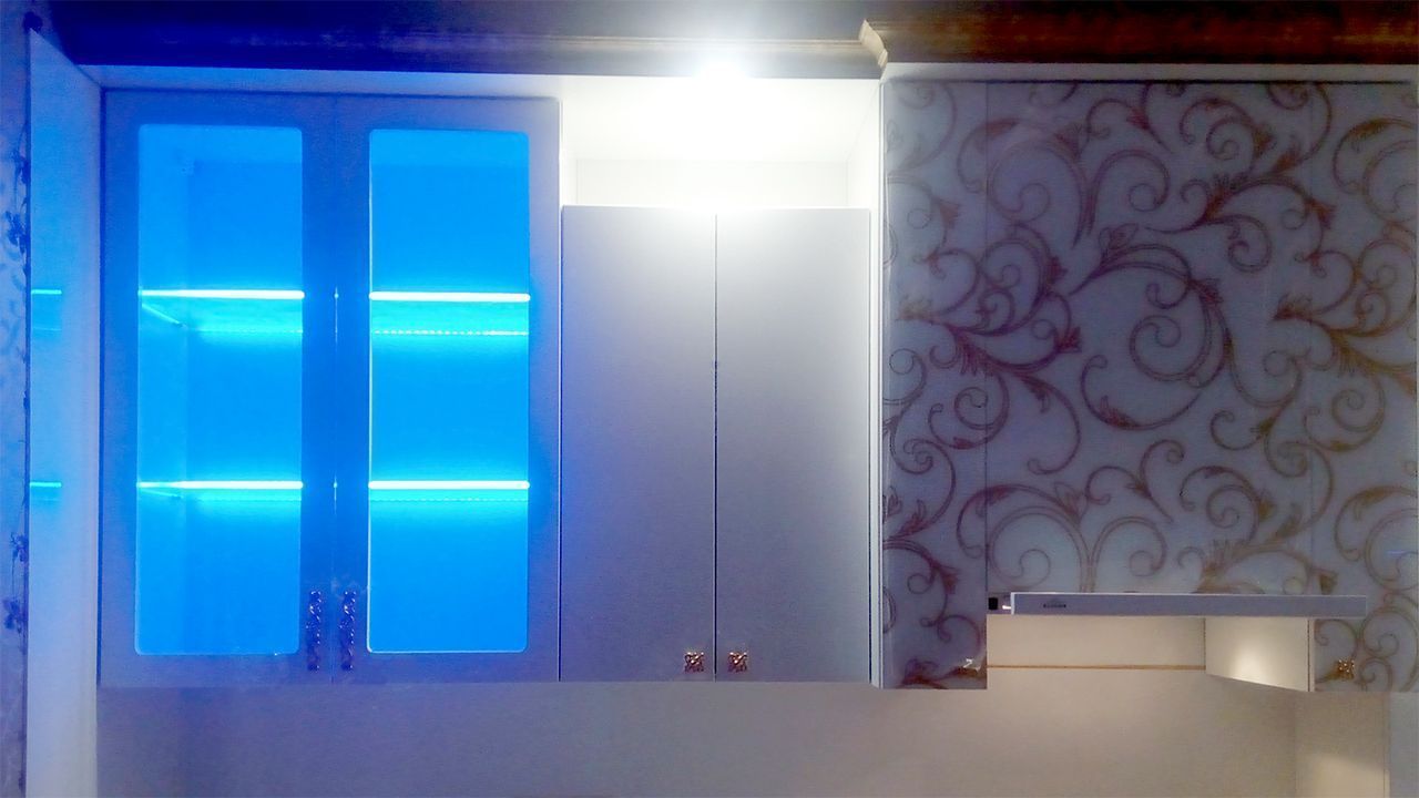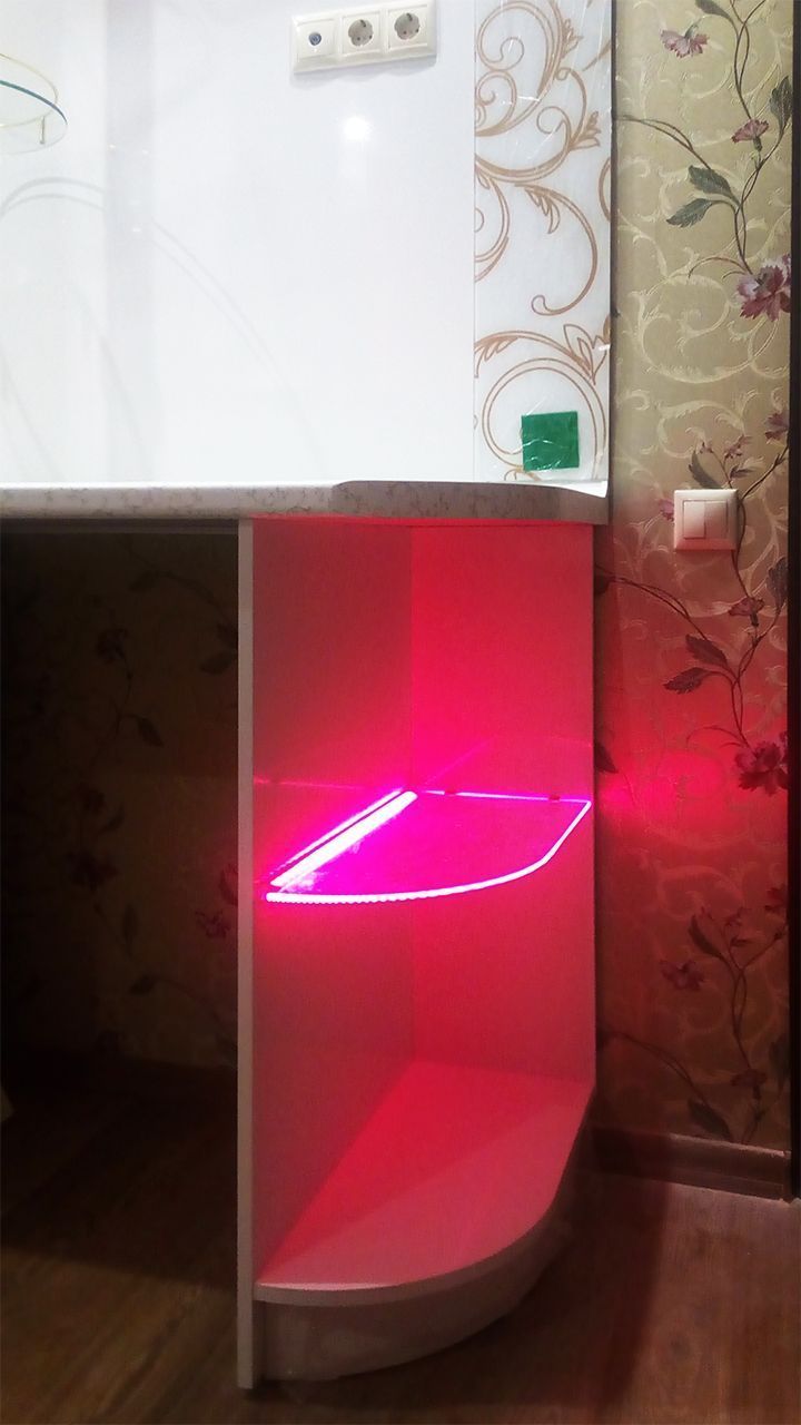 В данном проекте применена многоцветная RGB светодиодная лента, управление которой осуществляется дистанционно, при помощи небольшого сенсорного пульта. Яркость ленты позволила подсветить не только само стекло, но и пространство внутри шкафов. Такая подсветка смотрится весьма эффектно и способна подчеркнуть красоту предметов, размещённых на стеклянных полках.