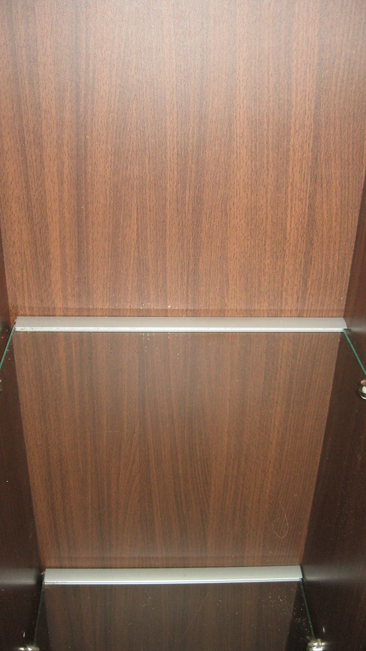 Для реализации подсветки стеклянных полок был применён специальный светодиодный профиль. Он устанавливается на кромку стекла со стороны примыкания к стенке шкафа, поэтому совершенно не бросается в глаза и аккуратно скрывает источник света - светодиодную ленту.