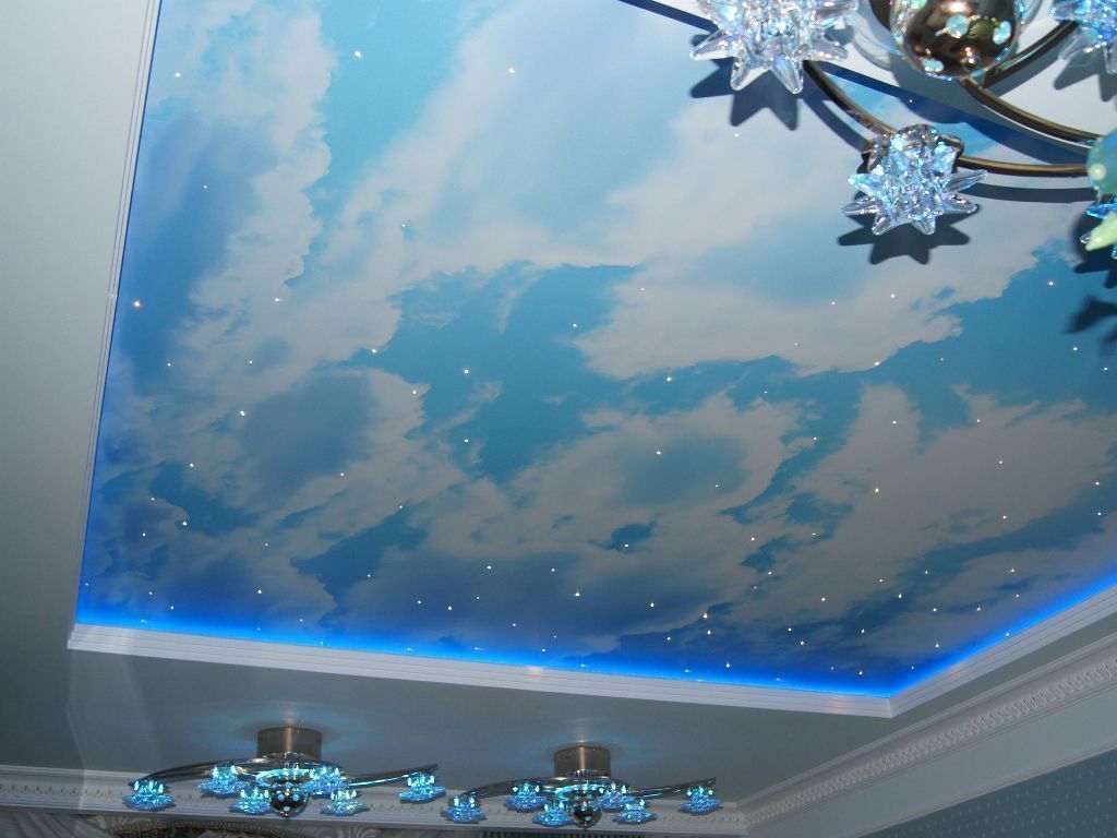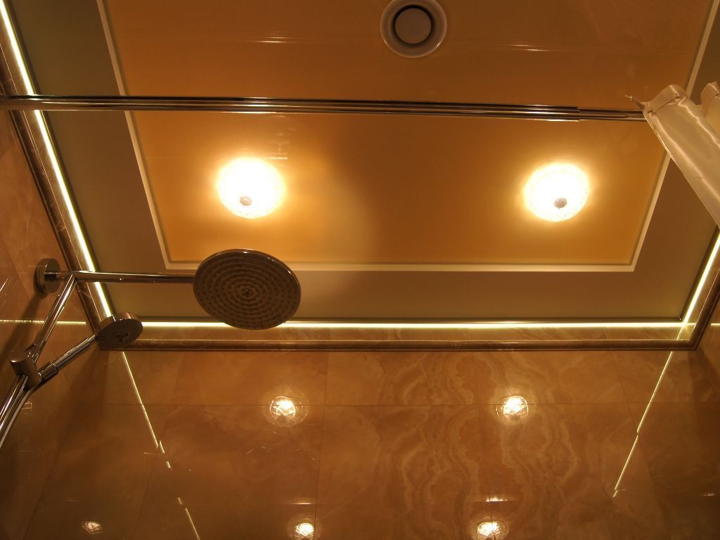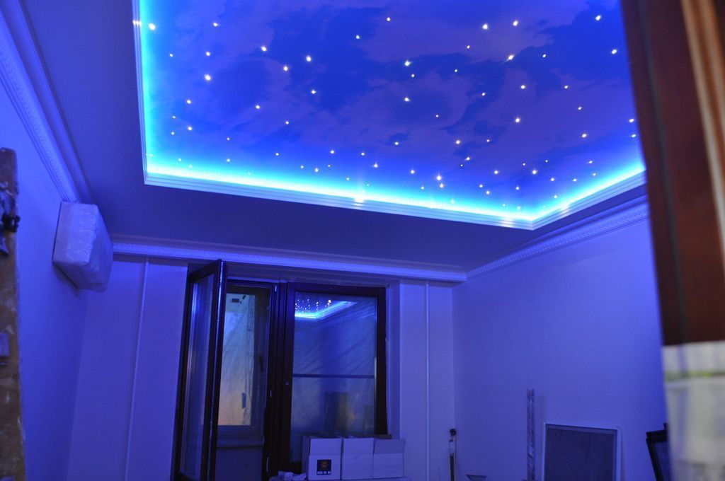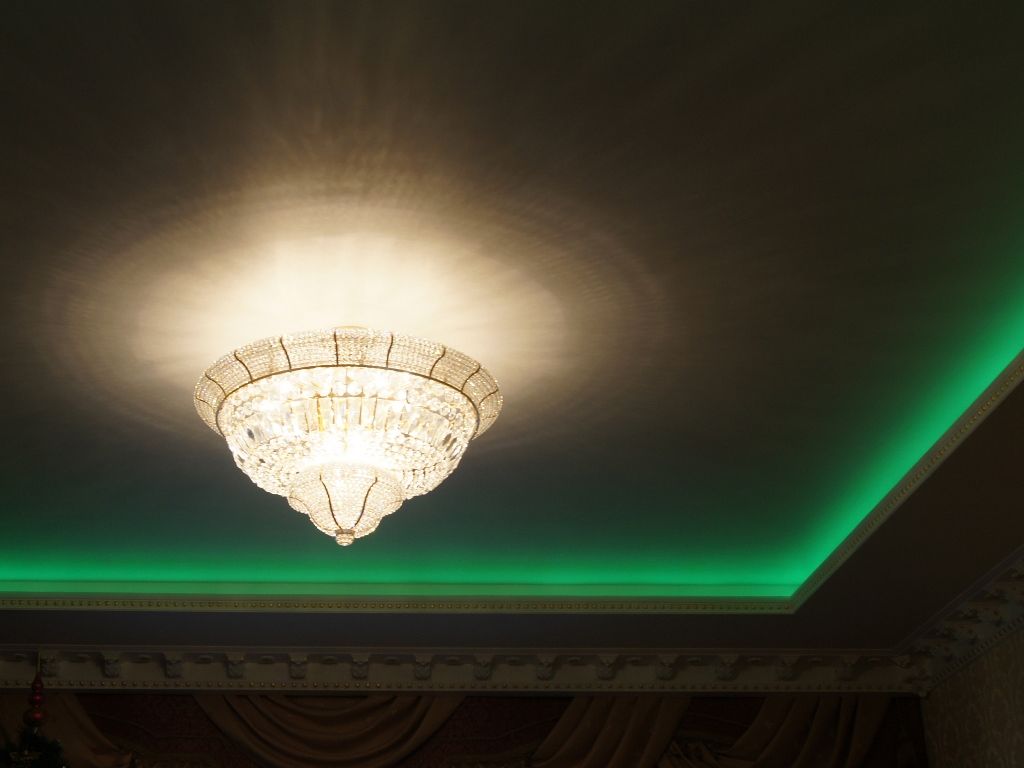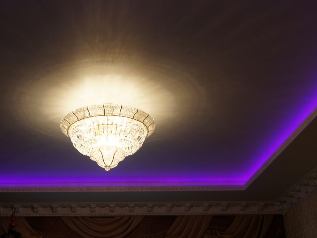 В данном проекте сочетание закарнизной многоцветной подсветки и основного освещения на основе классических люстр помогло создать особенный интерьер. Для освещения коридора были применены многоуровневые потолки со светодиодной RGB лентой. В детской комнате было создано звездное небо с многоцветной контурной подсветкой светодиодной лентой и необычными светильниками, меняющими свет за счет примененных в них RGB светодиодов.