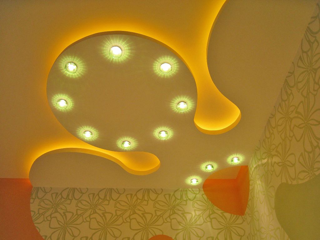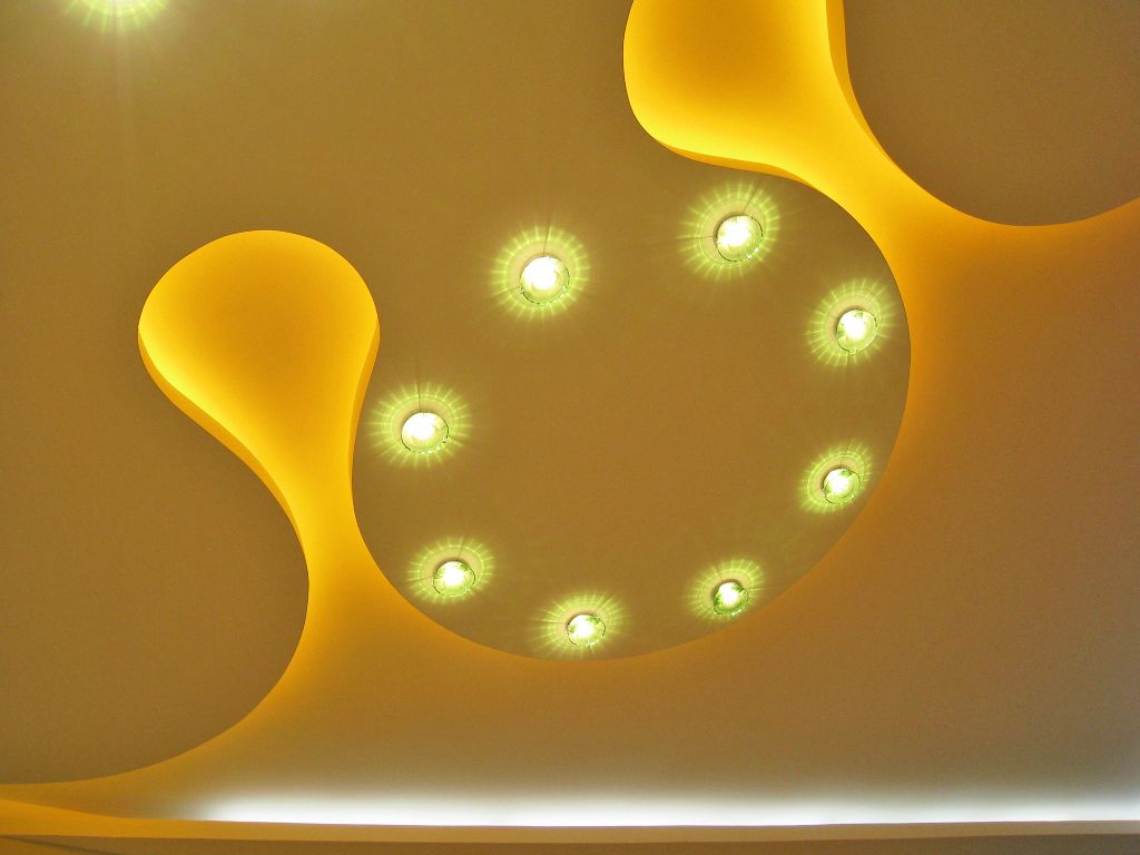 Достаточно низкие потолки не позволили применять привычные люстры, поэтому выбор пал на встроенные светильники, контурную подсветку потолков из гипсокартона и витражные световые потолки.