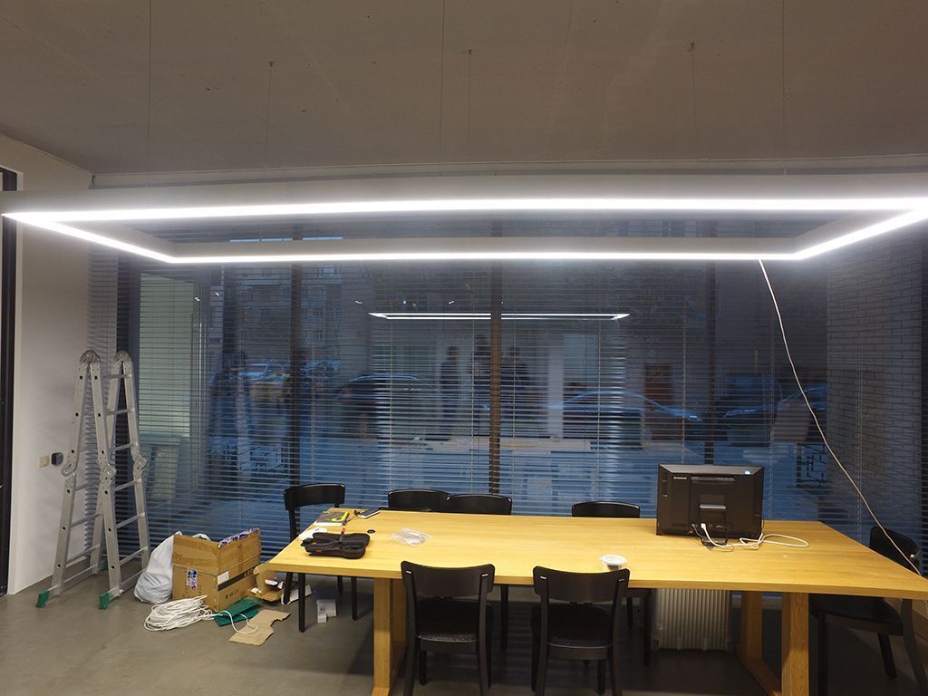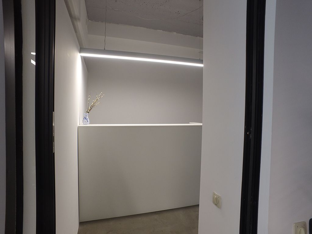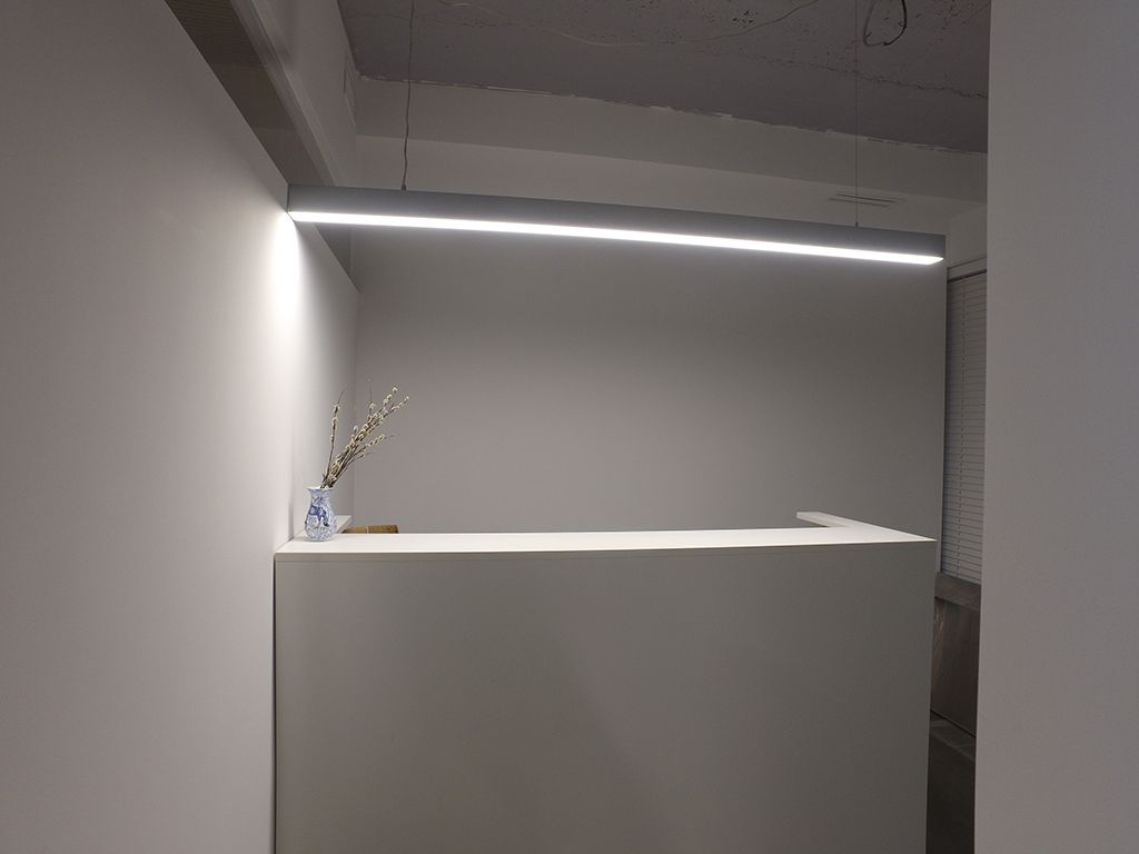 Для освещения стойки приёмной (ресепшена) использован один цельный профиль, установленный на подвесы. В конференц-зале решение более интересное: профили объединены в единую подвесную конструкцию прямоугольной формы. Для этого концы профилей были срезаны под углом 45 градусов для их плотной стыковки и скреплены между собой специальными соединителями. Светильник получился ярким и эффектным - не в последнюю очередь благодаря матовому экрану, превращающему свечение в единую линию света.